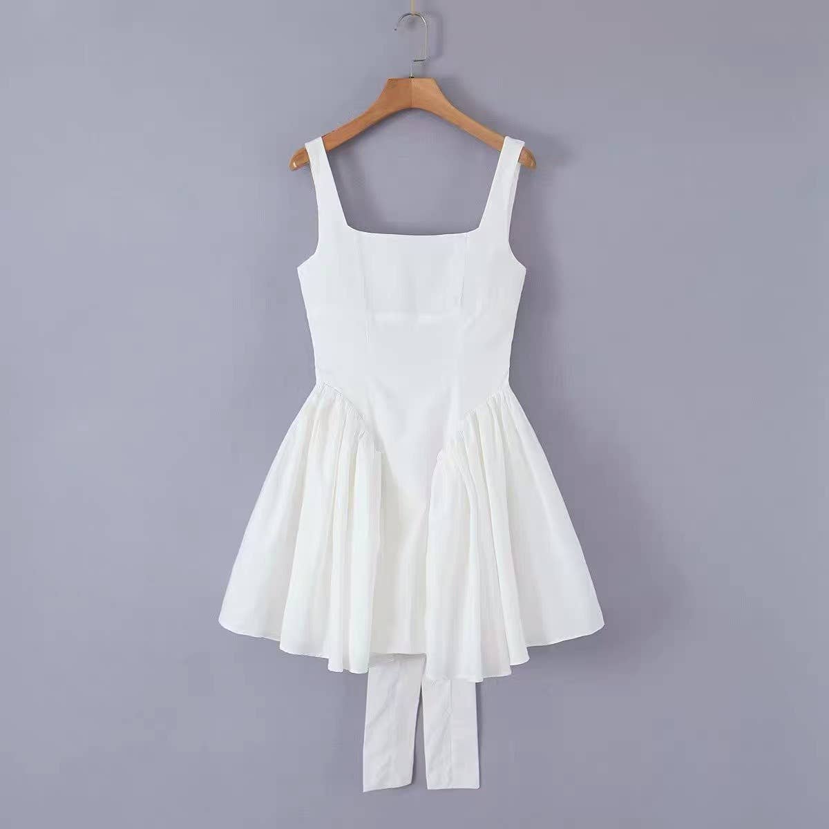 This mini dress features a delightful back bow and a sweet sleeveless design, perfect for adding a touch of playfulness to your wardrobe.