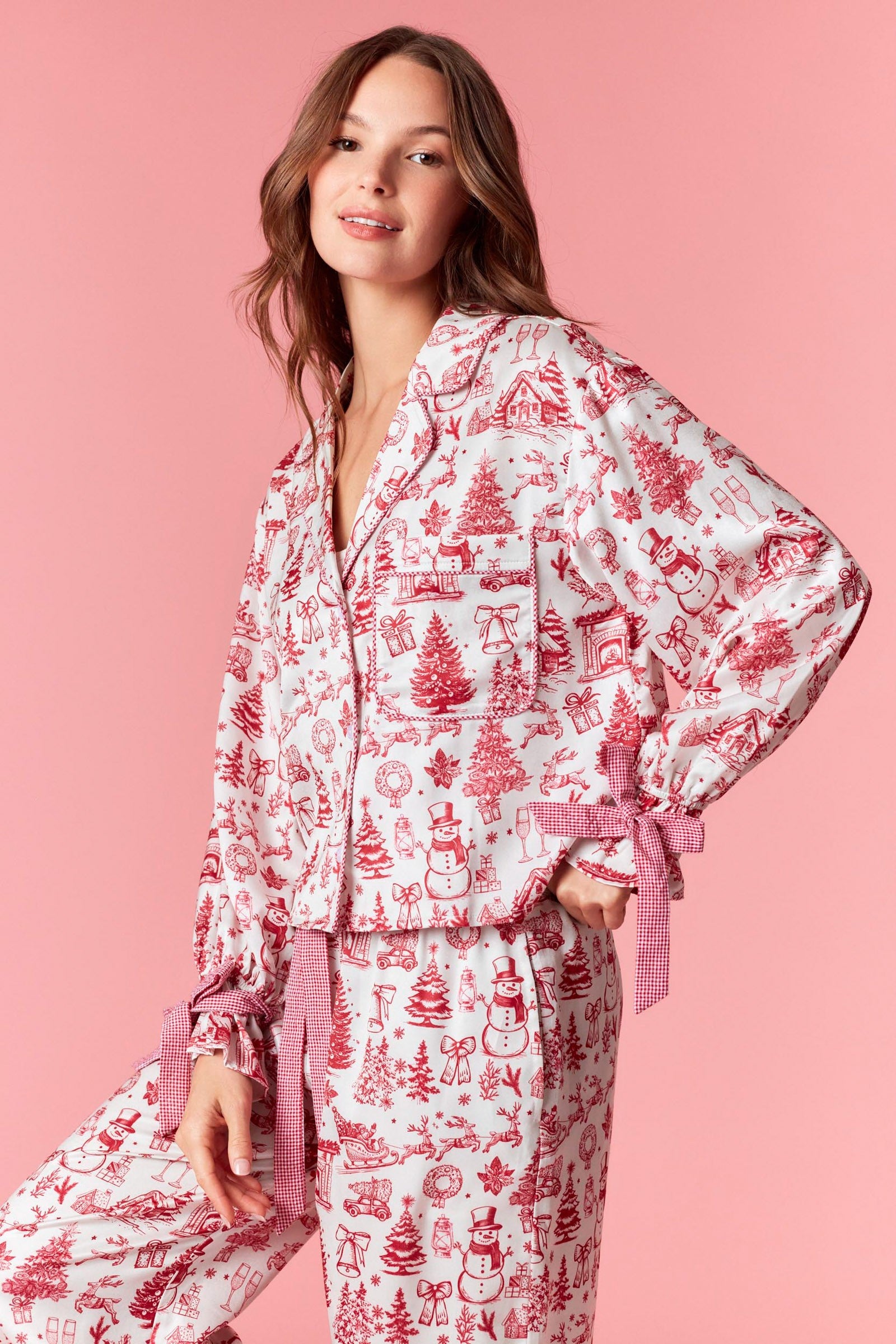 Elevate your holiday loungewear with this sophisticated satin gingham pajama set in festive red. Crafted from 100% polyester, the ensemble features a classic collar neckline and long sleeves for timeless appeal. The signature tie detail at the waist adds refined elegance, while the full-length cut ensures comfortable coverage. Modeled by our 5'9" fit specialist wearing size Small (bust 30.5", waist 24", hips 34.5"), this set seamlessly transitions from cozy nights to casual holiday gatherings.