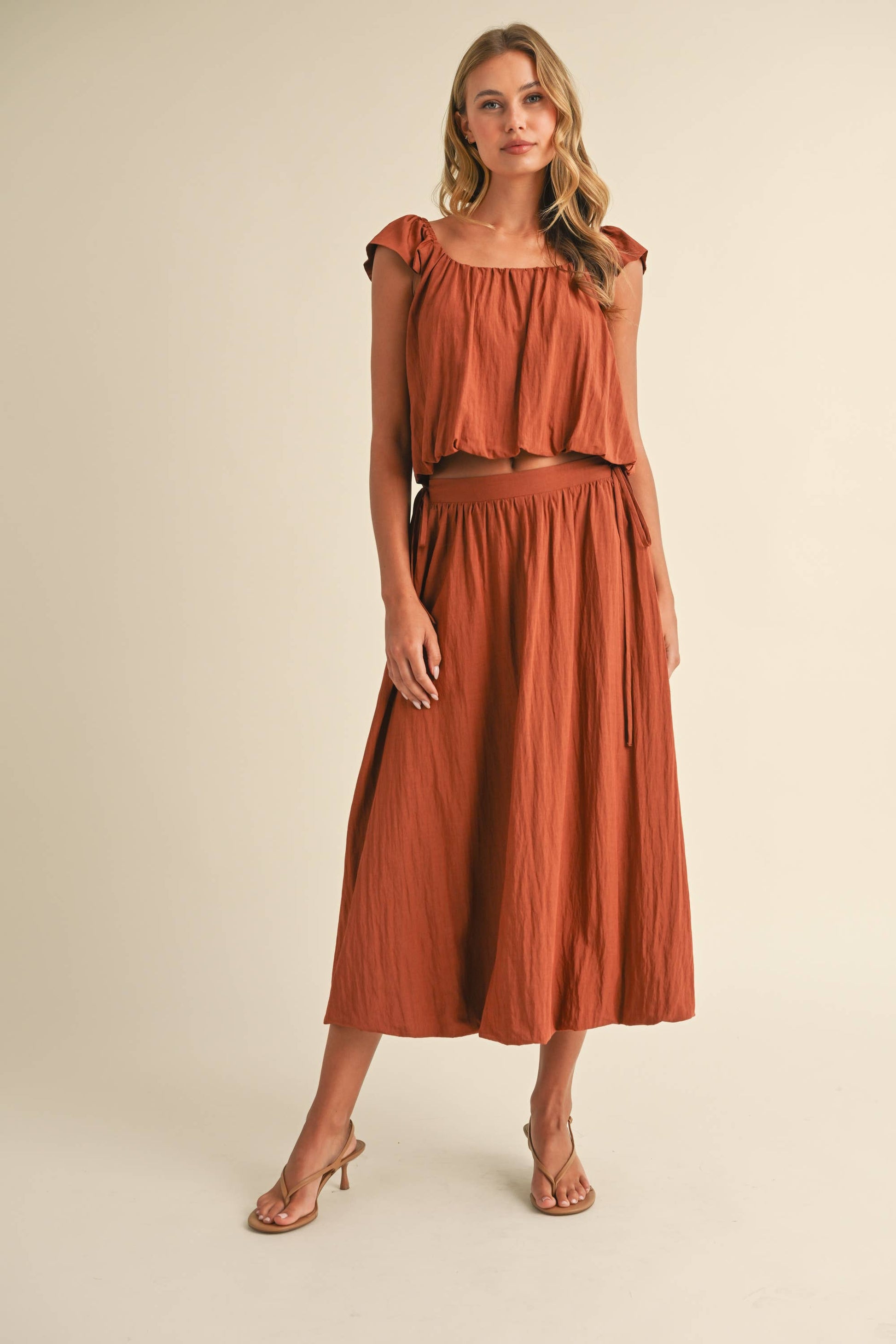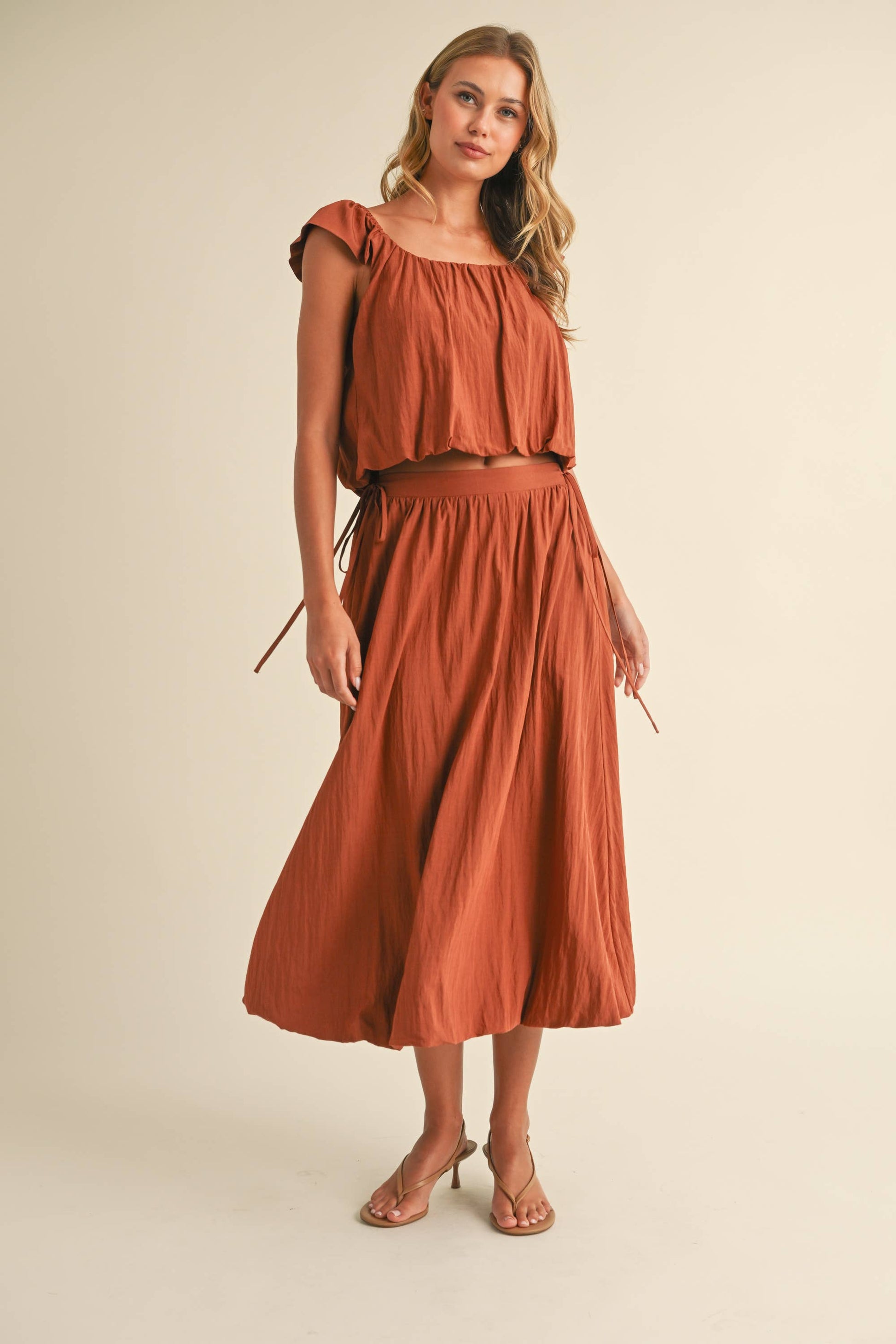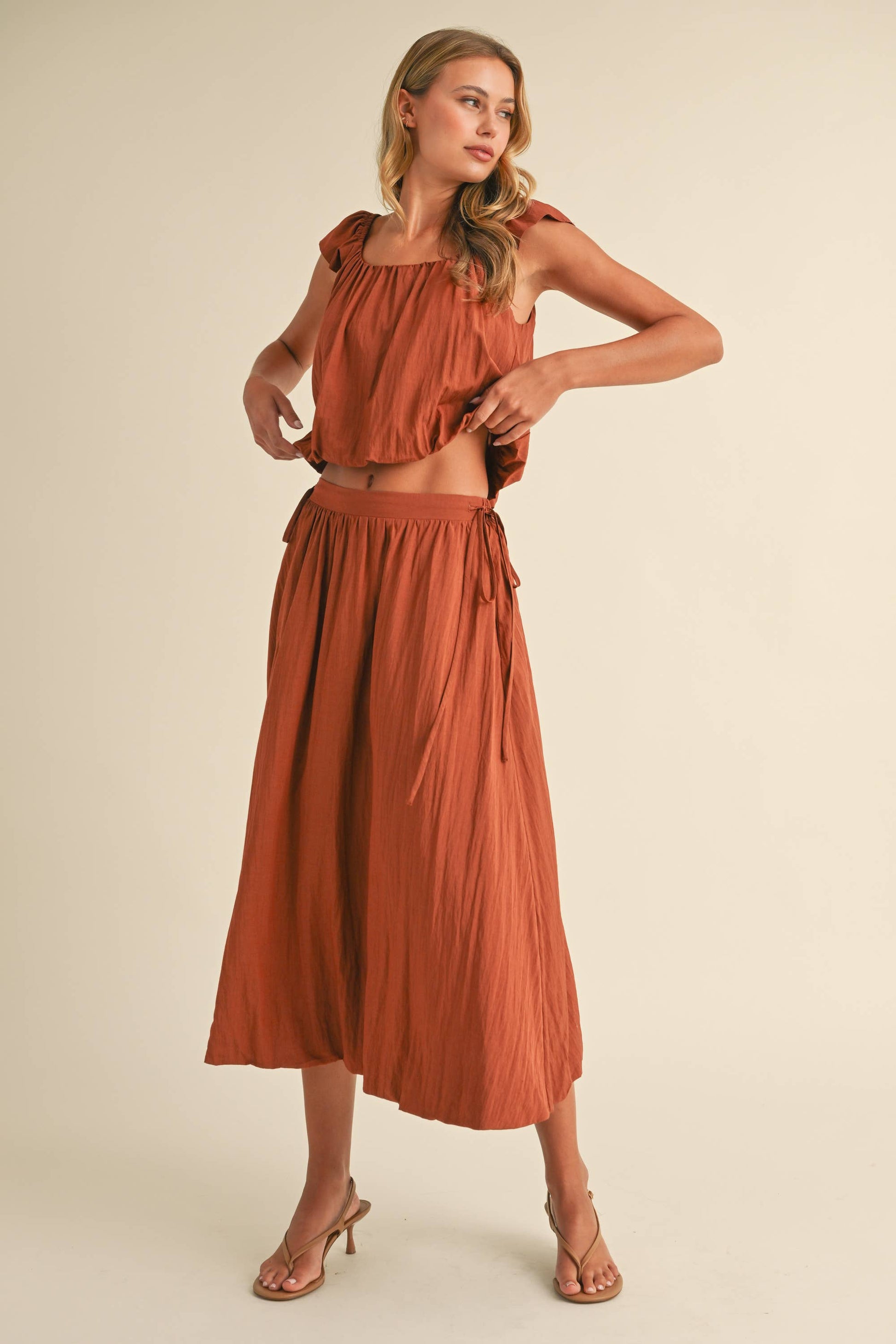 Sleeveless flutter cap sleeve top combined with a bubble midi skirt, highlighted by side tie details on the skirt’s waistband. Available in Rust color.
