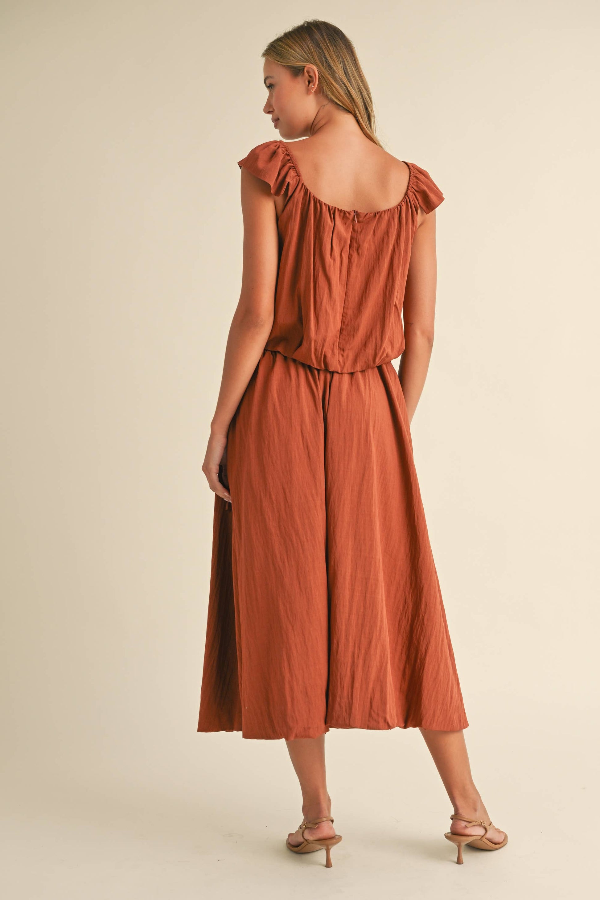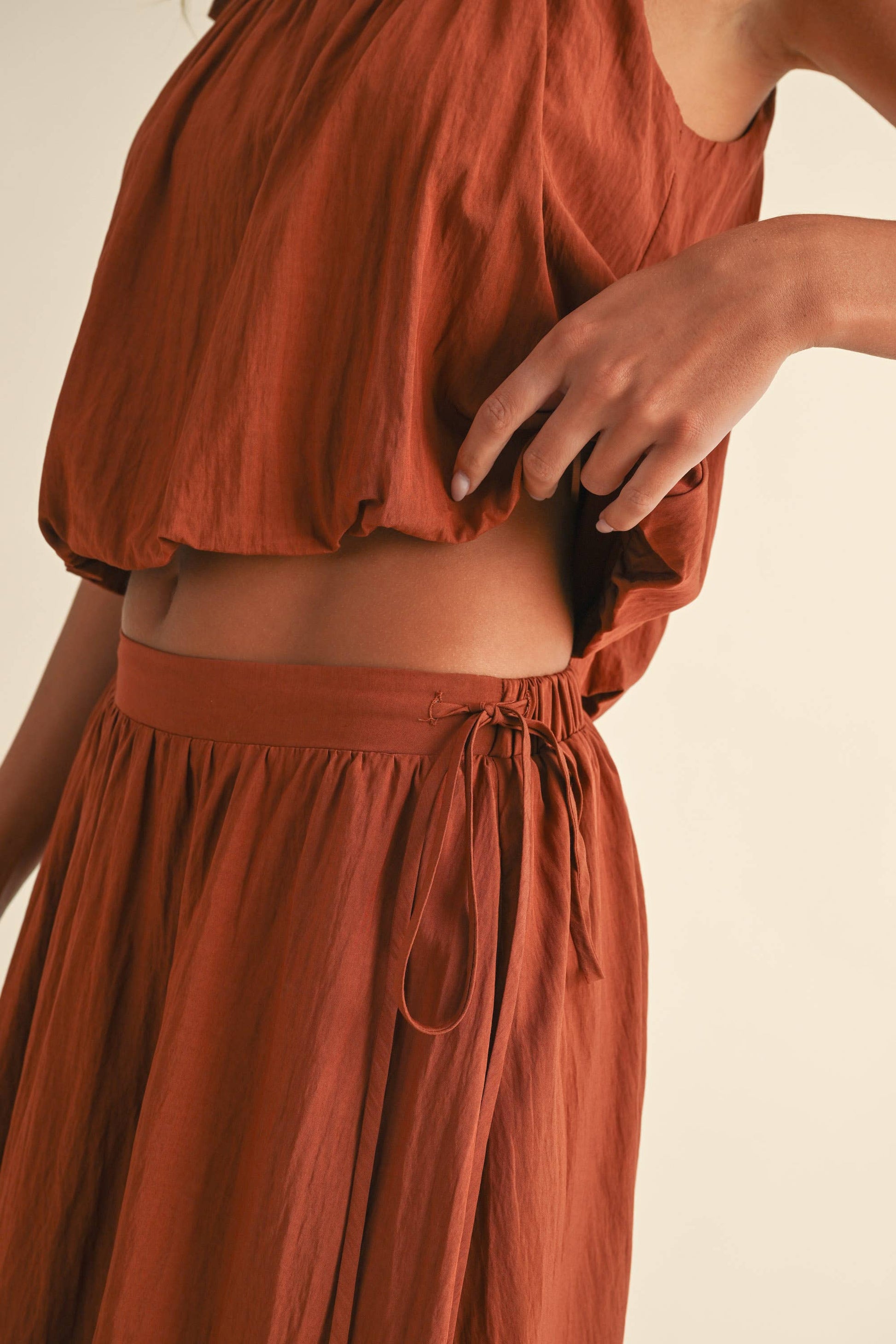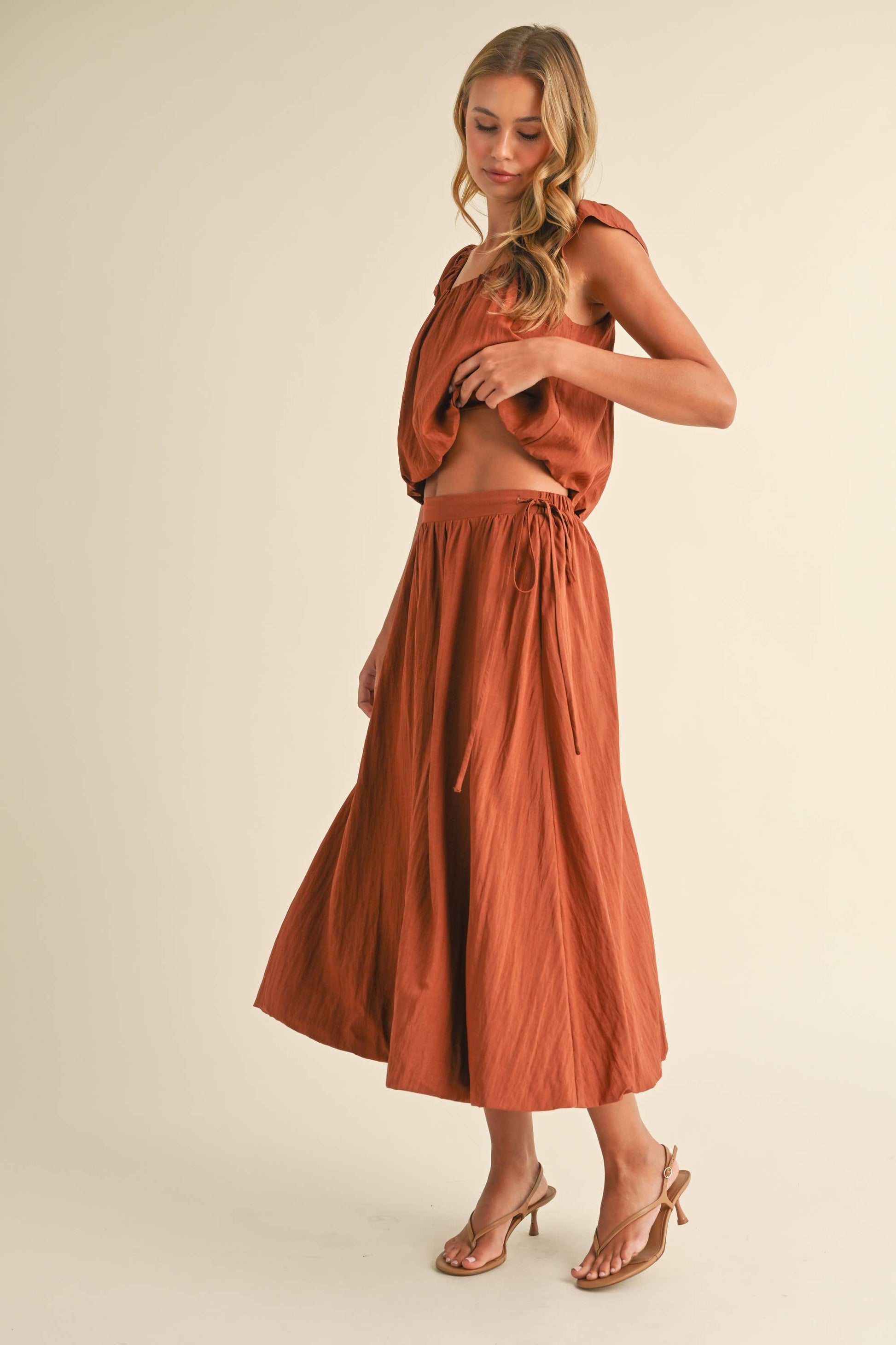 Sleeveless flutter cap sleeve top combined with a bubble midi skirt, highlighted by side tie details on the skirt’s waistband. Available in Rust color.