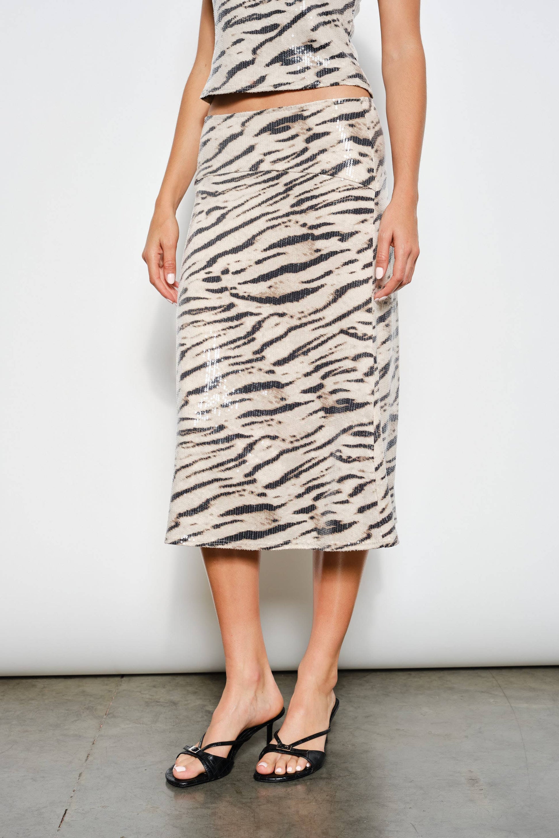 Make a bold statement with the Zebra Sequin Midi Skirt—where untamed style meets pure glamour. This daring piece features eye-catching sequin detailing in a striking zebra pattern that demands attention. The elastic waistband delivers all-day comfort, while the fully lined construction ensures a polished silhouette. Perfect for those ready to embrace their wild side and radiate confidence, this skirt transforms any outfit into an unforgettable moment of sequined sophistication.