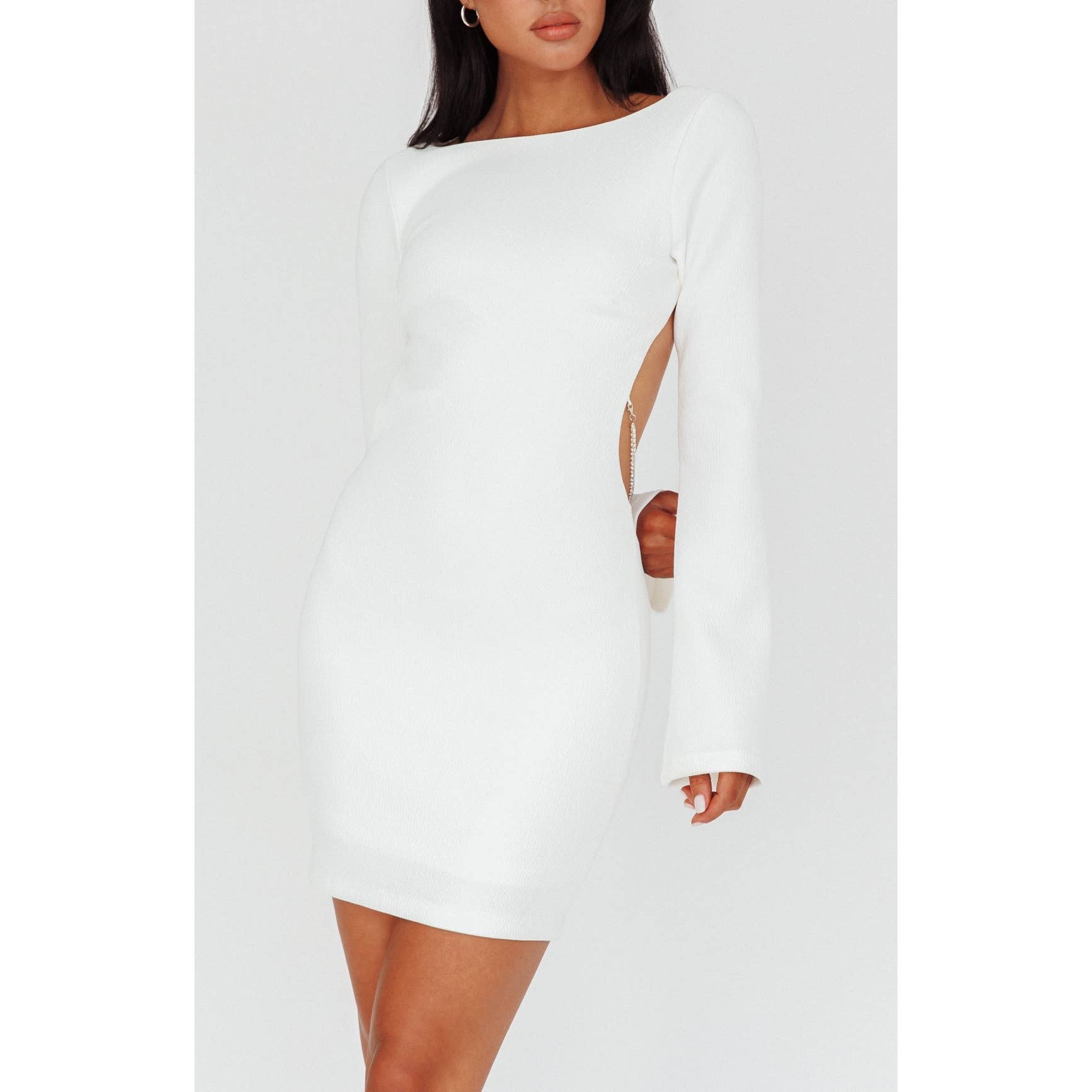 Discover the allure of our Diamond Open Back Chain mini dress, featuring an open back and slight stretch. Made from 90% polyester and 10% spandex, this dress exudes luxury and sophistication.