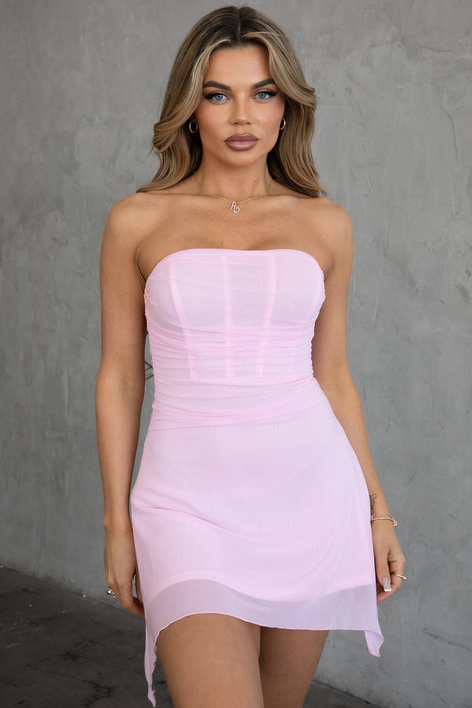 This flowy pink dress is a perfect balance of classic and modern style. With its strapless, corset bodice and draped sweetheart neckline, this ballet mesh A-Line mini dress offers a flattering fit. The A-line asymmetrical hem skirt and hidden zipper closure at the back complete the look.