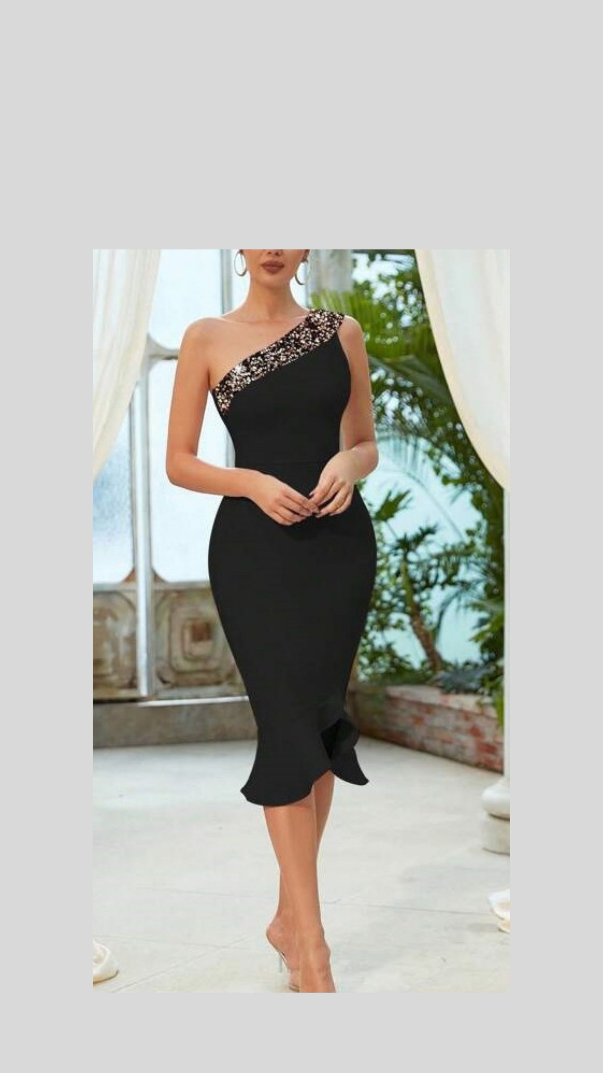 Make a statement with the Midi Mermaid Dress, a must-have for any special occasion. This one-shoulder dress, adorned with sequins, will elevate your style and add a touch of luxury to your look. Indulge in the glamour and sophistication of the Midi Mermaid Dress. A true essential for any elegant event, this one-shoulder dress is beautifully embellished with shimmering sequins. Step out in style and make a statement with this luxurious and exquisite piece.