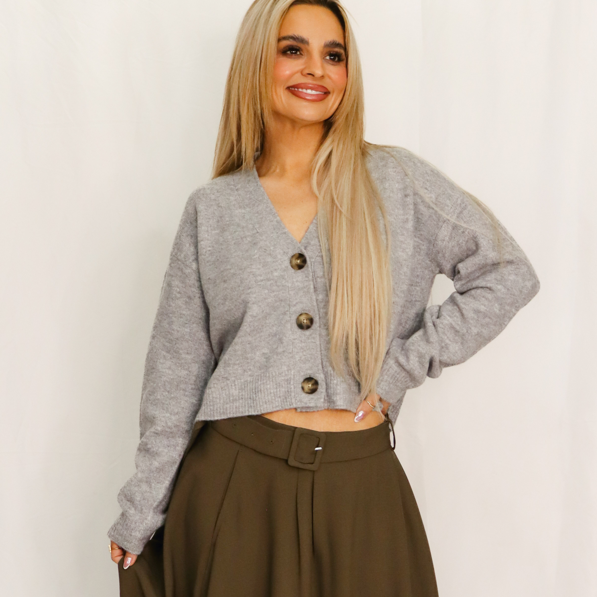 This expertly-crafted grey cardigan is made from sustainable materials and brings a touch of sophistication to your wardrobe. With a waist-length cut and a classic V-neck, it's the perfect addition to any outfit.