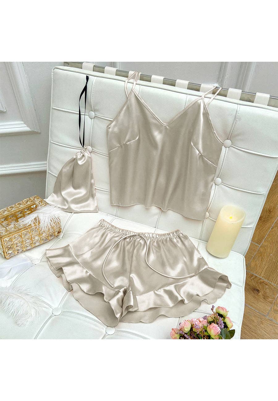 The satin cami and short set comes in a gold box and pink ribbon ready to gift. The satin shorts are detailed with cute ruffle hem on the shorts. Features a satin material, v neck line, spaghetti strap top and tie waist shorts. Pair it together with fuzzy slides for a cozy look.