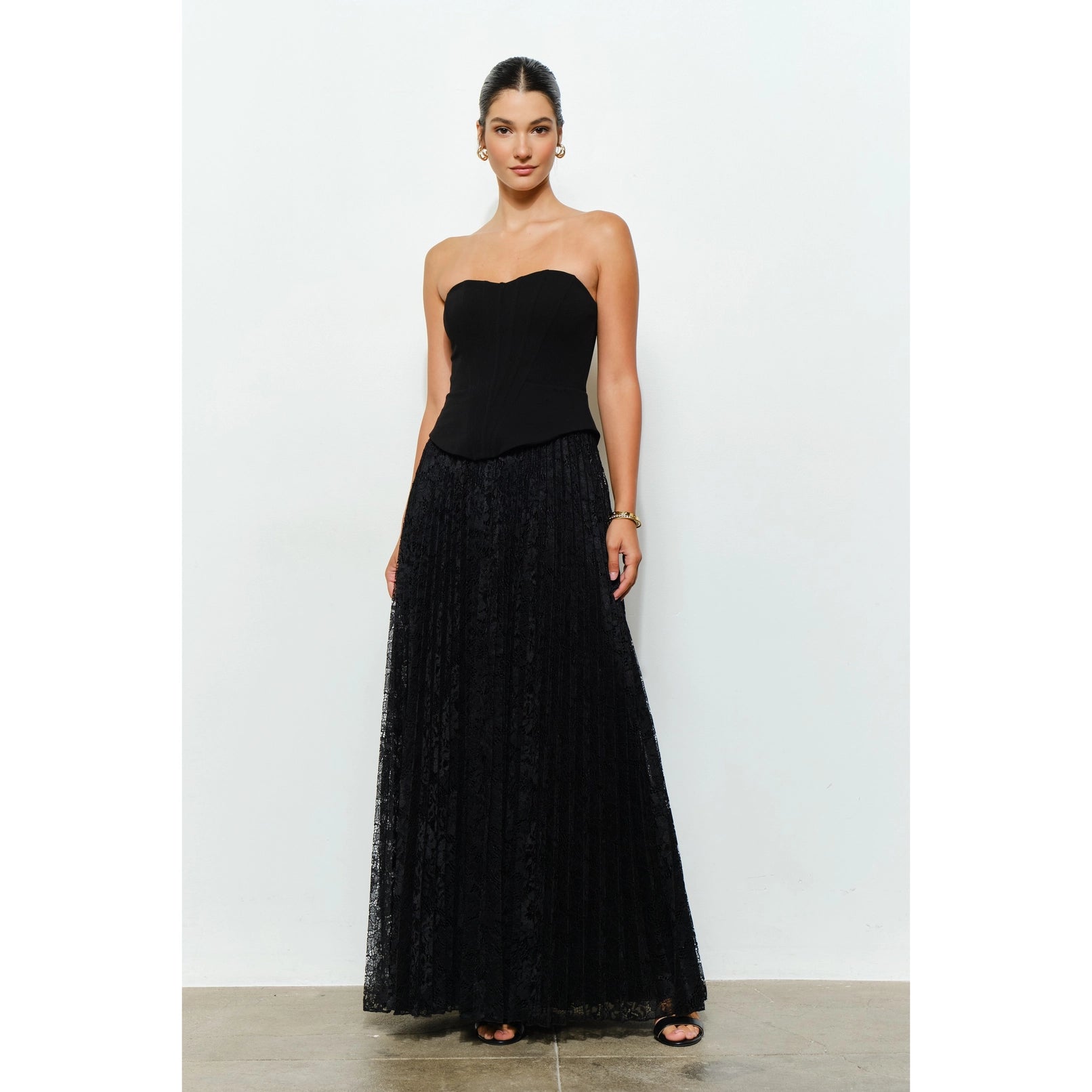 This sophisticated strapless gown combines architectural elegance with romantic movement. The structured corset bodice features a refined peplum accent, while the lace-up back provides adjustable support and a striking visual element. A concealed rear zipper ensures effortless dressing, while the voluminous pleated maxi skirt flows gracefully with every step. The design balances sculptural precision with fluid femininity, making it an exceptional choice for formal occasions, weddings, and upscale events. Model is 5'9.5" wearing size small.