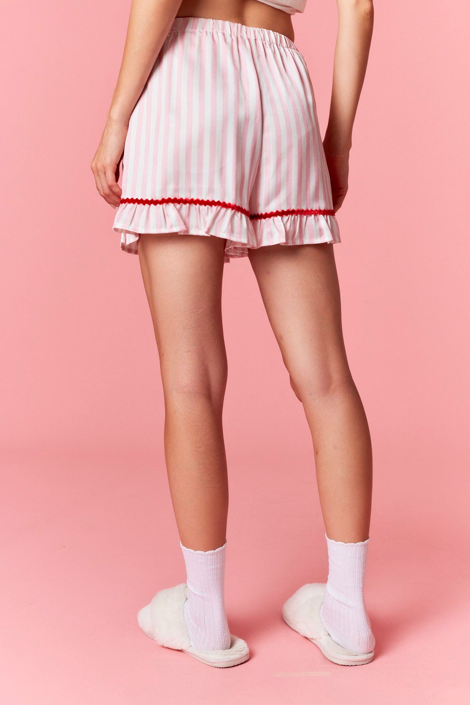 Crafted from premium polyester, this pajama set combines comfort with contemporary style. The distinctive striped velvet fabric offers a luxurious feel against the skin, while the wavy edge detailing adds visual interest to the design. Features a classic collar neckline, long sleeves, and shorts for versatile all-season wear. An ideal choice for those seeking quality sleepwear that doesn't compromise on sophistication.